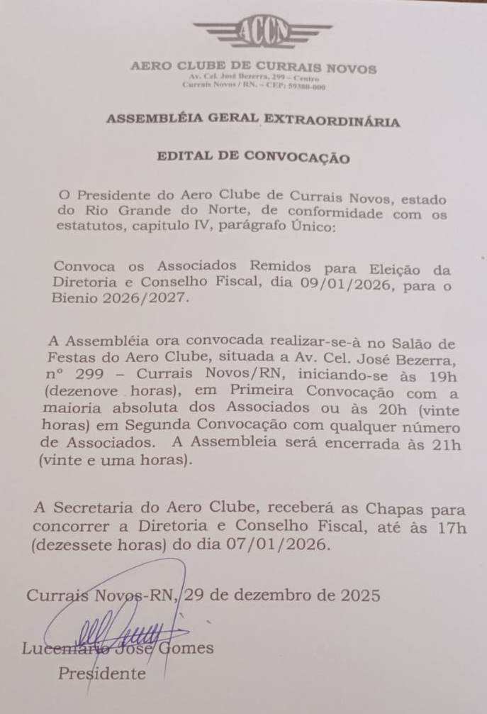 O Aero Clube de Currais Novos (ACCN) publicou edital de convocação para a realização de Assembleia Geral Extraordinária destinada à eleição da Diretoria e do Conselho Fiscal para o biênio 2026/2027.