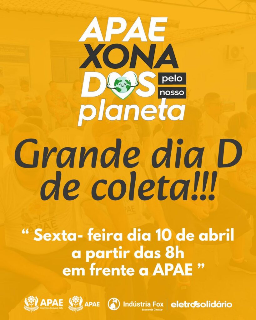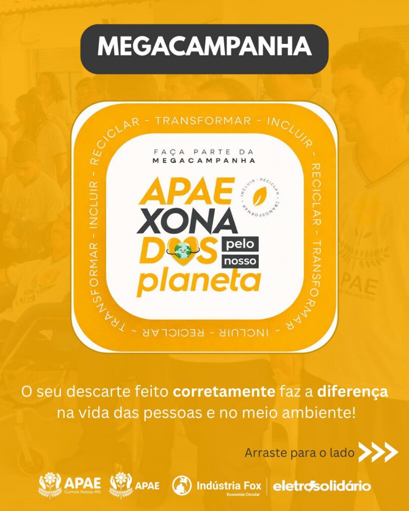 A APAE Currais Novos promove, nesta sexta-feira, 10 de abril, a partir das 8h, uma grande mobilização ambiental com foco no descarte correto de resíduos eletrônicos. A ação faz parte da “Megacampanha – APAE Zona dos Pelo Nosso Planeta”.