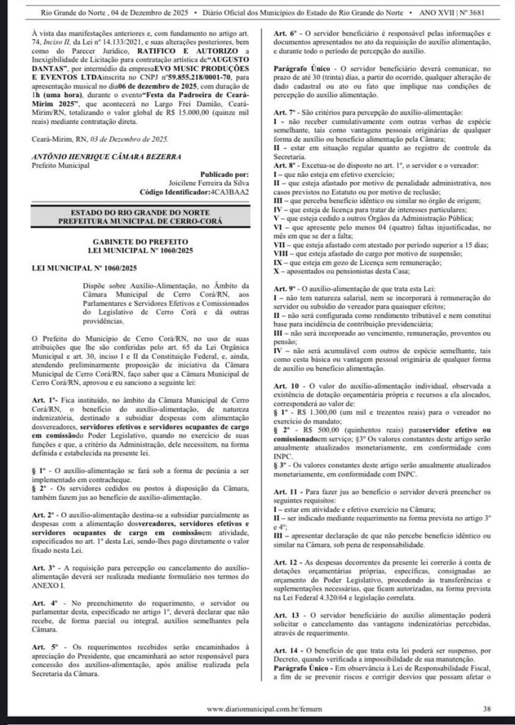 A Câmara Municipal de Cerro Corá/RN aprovou, e o Poder Executivo sancionou, a Lei Municipal nº 1.060/2025, que institui auxílio-alimentação mensal no âmbito do Poder Legislativo.