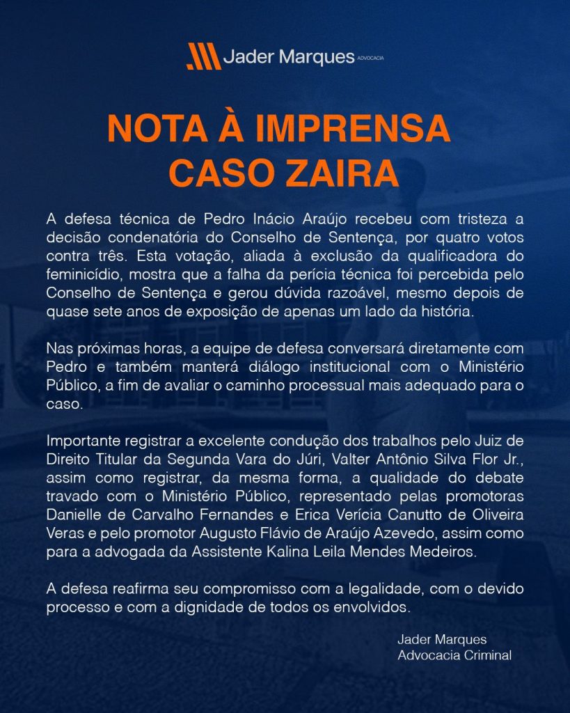 A defesa técnica de Pedro Inácio Araújo divulgou, nesta quinta-feira (4), uma nota à imprensa após a decisão do Conselho de Sentença que resultou na condenação do réu pelos crimes de homicídio e estupro contra Zaira Cruz. A equipe jurídica afirmou ter recebido o veredito “com tristeza”, destacando que a votação quatro votos a três demonstraria, segundo eles, que houve dúvida razoável entre os jurados.