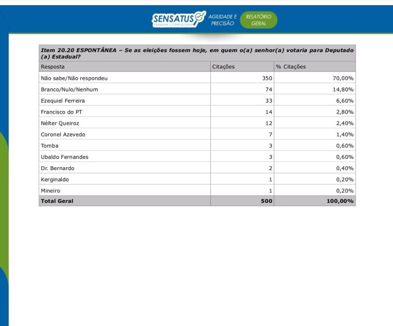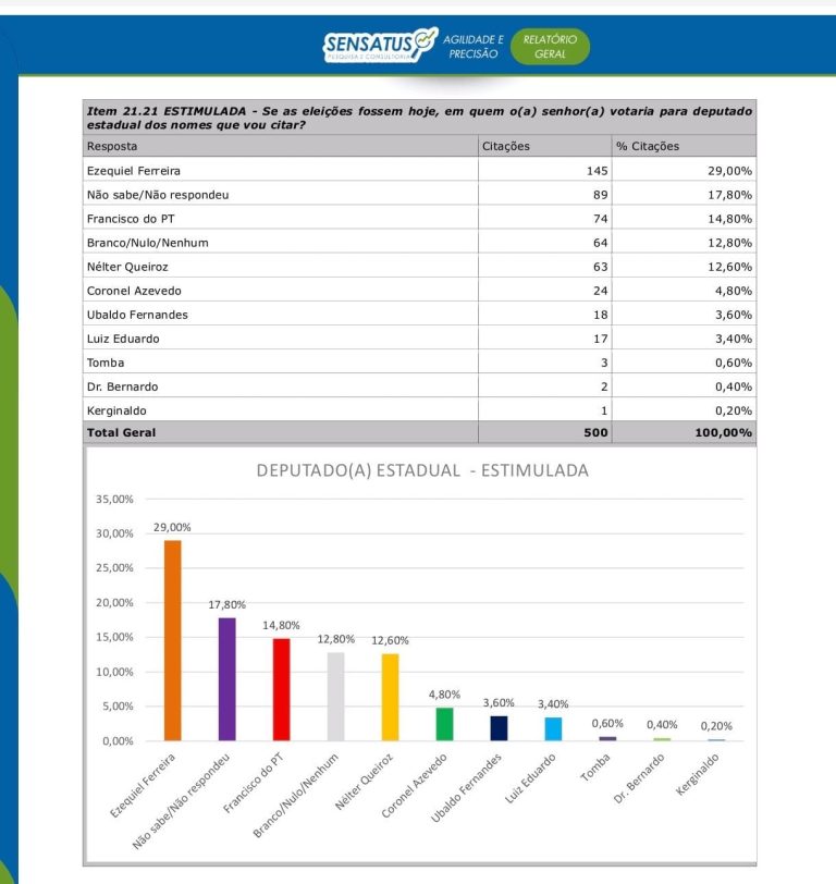A pesquisa Sensatus ouviu 500 pessoas na zona urbana e na zona rural, a margem de erro é de 4,82 pontos percentuais para mais ou para menos, com intervalo de confiança de 95%.