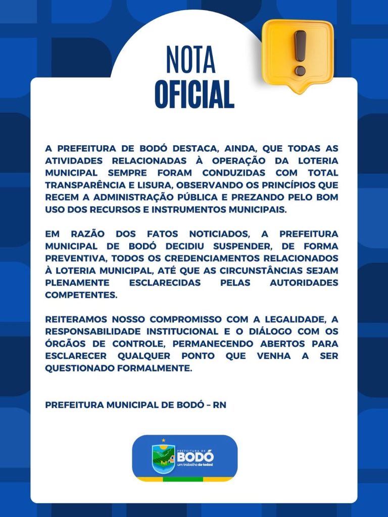 A Prefeitura Municipal de Bodó (RN) divulgou duas notas oficiais para esclarecer informações recentes divulgadas pelo Ministério Público do Rio Grande do Norte (MPRN) sobre uma investigação relacionada à exploração da Loteria Municipal e ao suposto bloqueio de R$ 145 milhões.