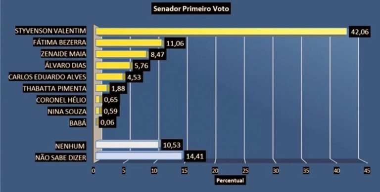 Ao ser apresentado os nomes de nove eventuais candidatos a senador para o primeiro voto dos eleitores, Styvenson Valentim aparece em primeiro lugar com 42,06% das intenções de votos, seguido da governadora do Estado, Fátima Bezerra (PT), com 11,06%.