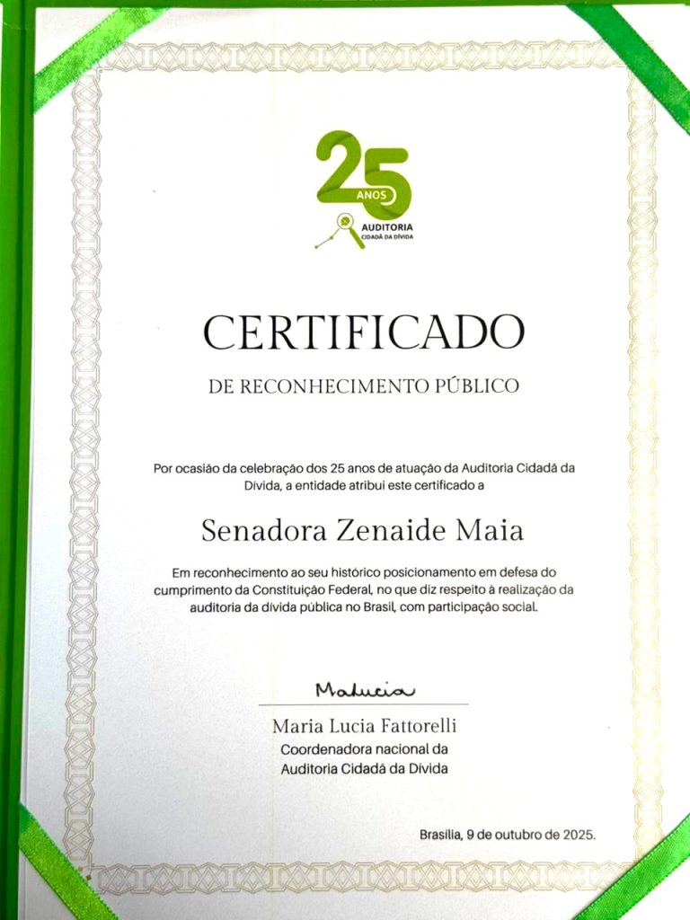 A senadora Zenaide Maia (PSD-RN) recebeu uma homenagem nacional da Auditoria Cidadã da Dívida (ACD) por sua defesa, dentro do Congresso Nacional, da auditoria da dívida pública brasileira, jamais feita no Brasil mesmo com previsão constitucional. Zenaide denuncia constantemente, no Parlamento, que o sistema financeiro engole 50% do orçamento geral da União todo ano, só sobrando 8% de recursos públicos federais, arrecadados via impostos cobrados da população, para financiar a saúde e a educação e apenas 0,25% para custear a segurança pública.